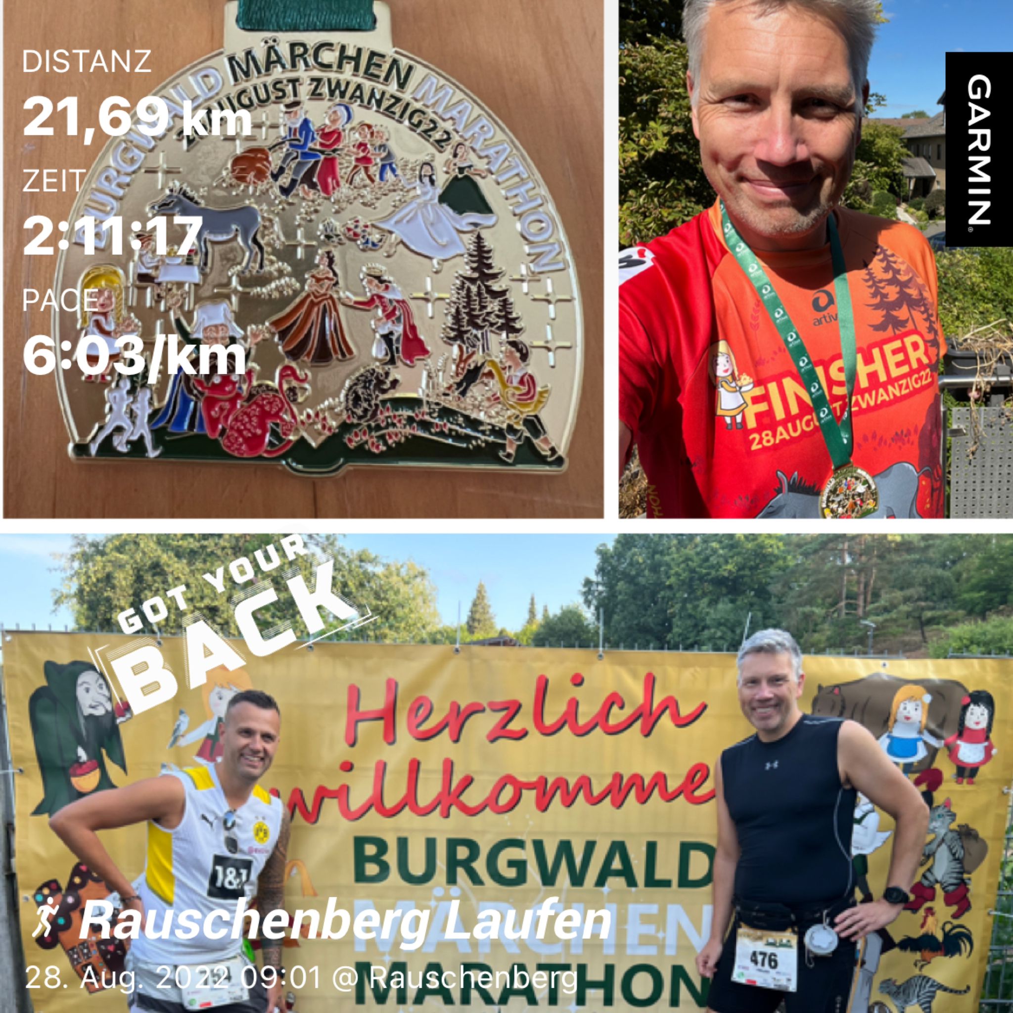 Beinahe zeitgleich ging Torsten Emmerich als „Hase“ an den Start des 4. Burgwald- Märchen-Marathons in Rauschenberg. Er belegte beim Halbmarathon in einer Zeit von 2:11:17 den 88.Platz unter den Männern und Platz 29 der AKM50. |