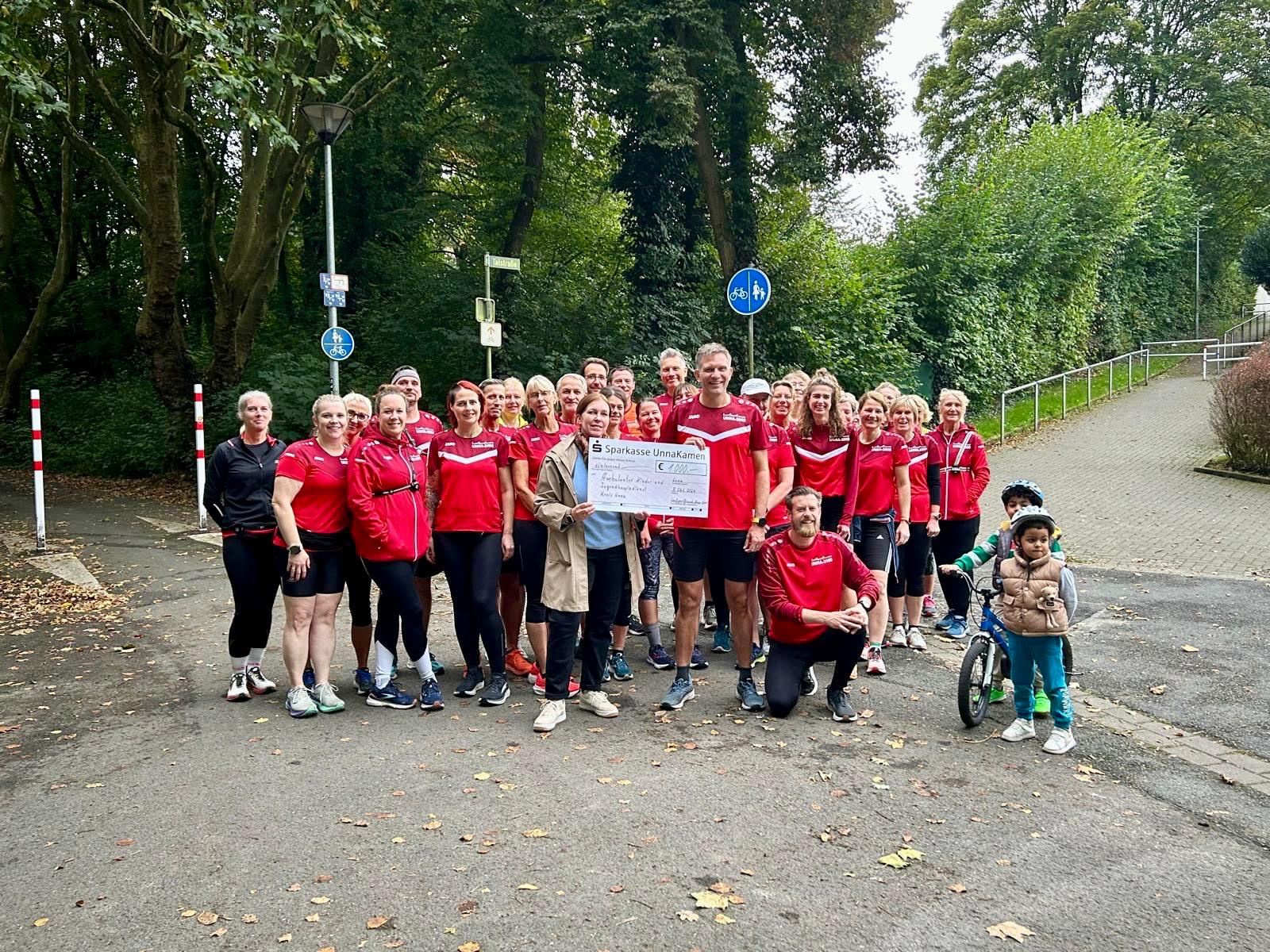 Die LSFler sammeln traditionell Spenden unter den Mitgliedern bei ihrer Vereinsmeisterschaft am Sorpesee. Zusammen mit dem eingenommenen Geld vom Getränkestand beim AOK Firmenlauf in Unna ist die stolze Summe von 1.000,00 EUR zusammengekommen, mit welcher die LSFler Menschen unterstützen möchten, die jede Hilfe gebrauchen können. Die Spende geht auch in diesem Jahr wieder an den Ambulanten Kinder- und Jugendhospizdienst des Kreises Unna. Im Bornekamp in Unna fand jetzt die Spendenübergabe an Nadine Franke vom Ambulanten Kinder- und Jugendhospizdienst statt, die sich sehr über die Spende freute.